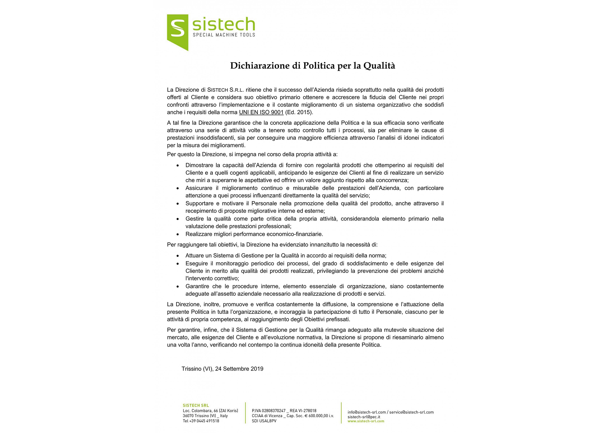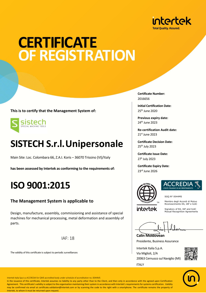 La Qualità per noi di Sistech è di fondamentale importanza. Oltre agli standard dettati dalla normativa ISO 9001, la progettazione, la produzione e la messa in servizio delle nostre macchine viene eseguita seguendo scrupolose procedure interne, al fine di garantire prodotti efficienti ed affidabili.